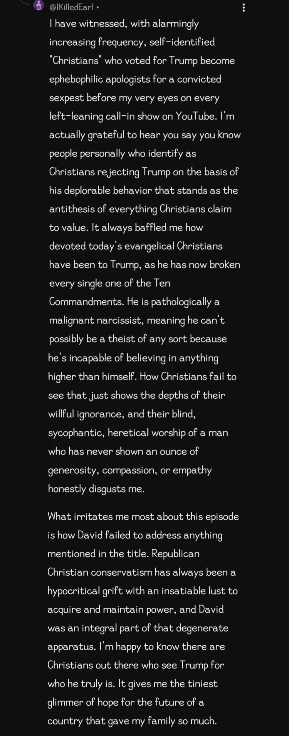I was pleasantly surprised to find this comment, as Trump's involvement in the Epstein controversy has incited a wave of brainwashed Christian MAGA supporters to dial into every left-leaning call-in show on YouTube and showcase the Olympic-level mental and moral gymnastics they're willing to subject themselves to as they defend the indefensible actions of their Dear Leader. The revulsion I feel at having to witness their cognitive pretzel-making makes a pile of cat vomit look appealing.