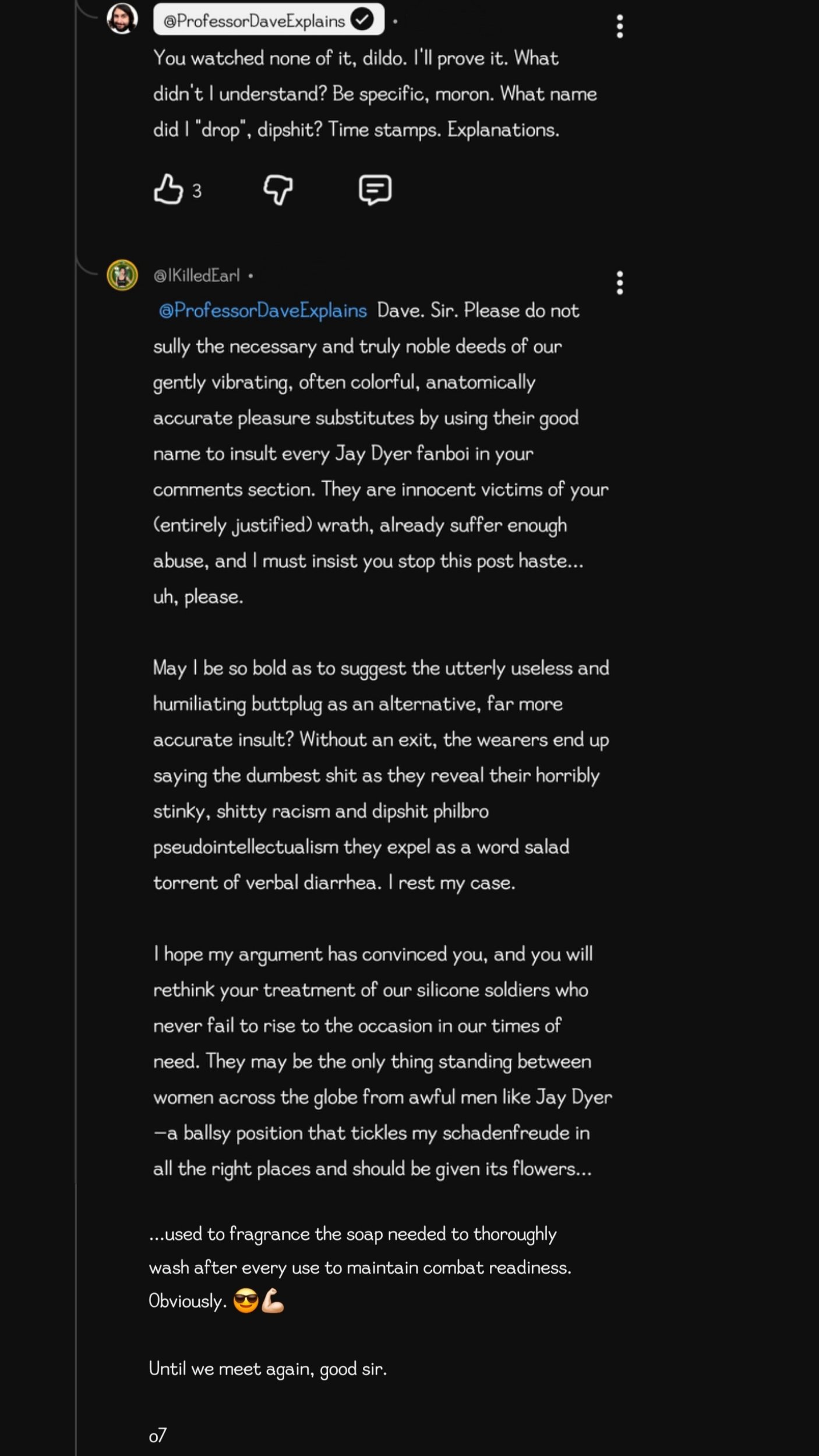 After seeing him use dildo as an insult at least two dozen times against the Jay Dyer accolytes, throwing shade about Dave’s latest video (seen here https://youtu.be/A3N77Kh2mvI?si=ocjV2eRyc4CGrMRZ), I decided enough was enough.